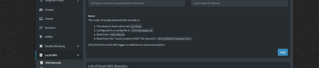 We are telling Pi-Hole to send any traffic for “truenas.domainname.com” to the local ip address of “192.168.1.100”